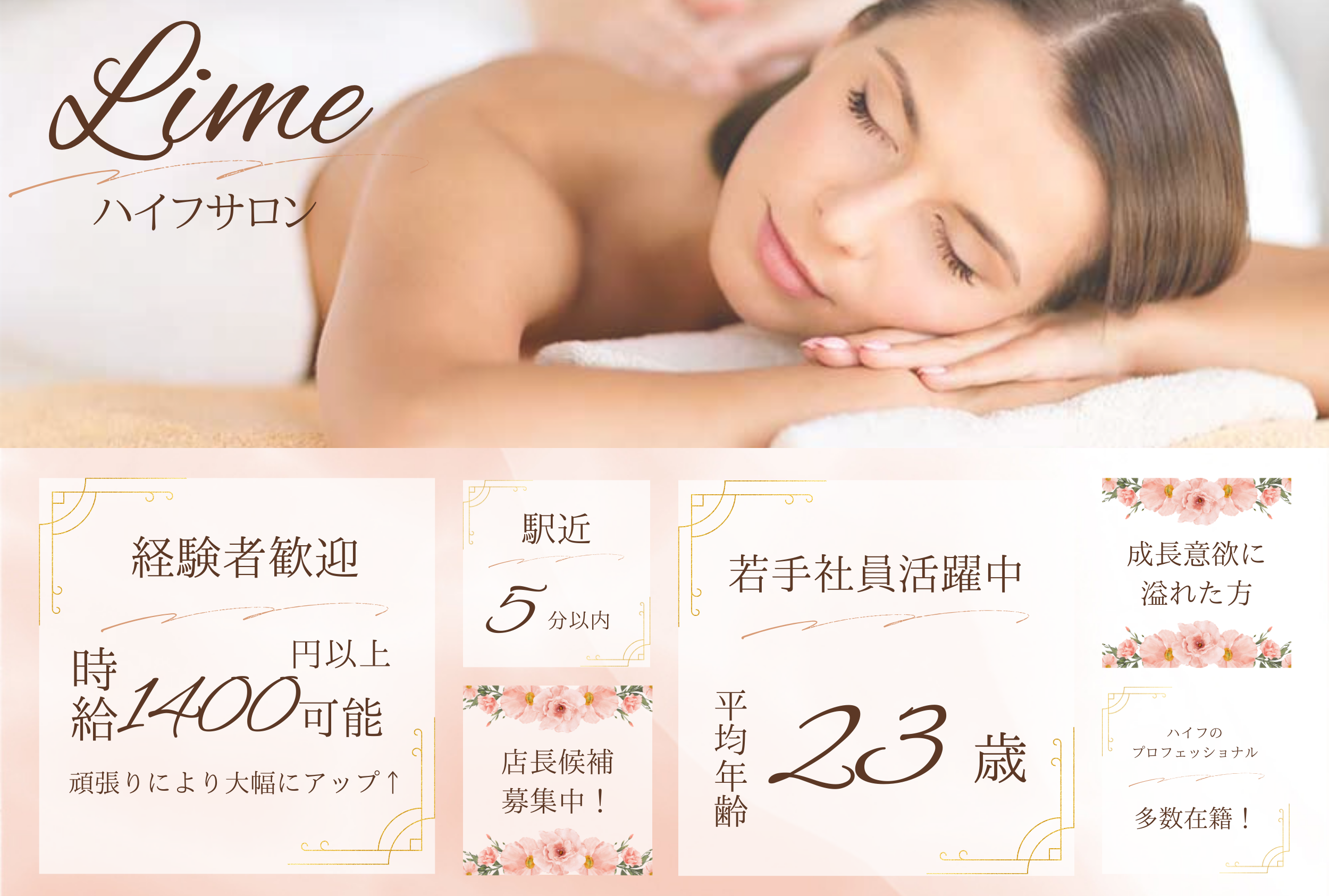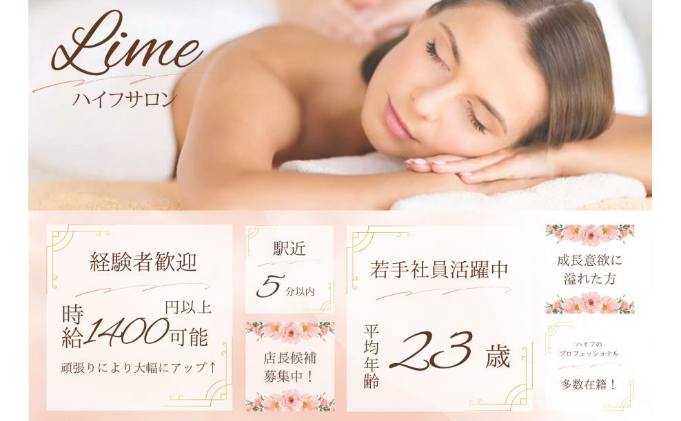===================================== ハイフ専門店LIMEは、スタッフの自己実現・自己成長を第一に考える社風があり、 そのため将来独立したいなどの目標ももちろん応援し、サポートしています! 給与も毎月固定ではなく、月ごと成果や頑張りに応じて評価する制度をとっており、とても刺激がある環境です♪ ノルマなどはないですが、成果に応じての給与を支払うというスタンスなので、 成長すればするほど高収入は可能です! ===================================== ☑LIMEの注目ポイント☆ ・年間休日120日 ・スタッフの平均年齢20代 ・半年で月給40万も可 ・個人の裁量を持って仕事可能 ・福利厚生充実(福利厚生欄をご覧ください) ・ノルマ無し ・集客好調(リピーター多数) LIMEに入ってから前職よりも多くの給与が貰えるようになった! 好きな時に休めるのでプライベートも充実できる! などの声をスタッフからよくもらいます☆ 定着率80%とLIMEで長く働き続ける方は多く、 一生働けるサロンとなっていますので、 ぜひ今の環境に不満、不安を抱えている人はお気軽にご相談ください♪ |