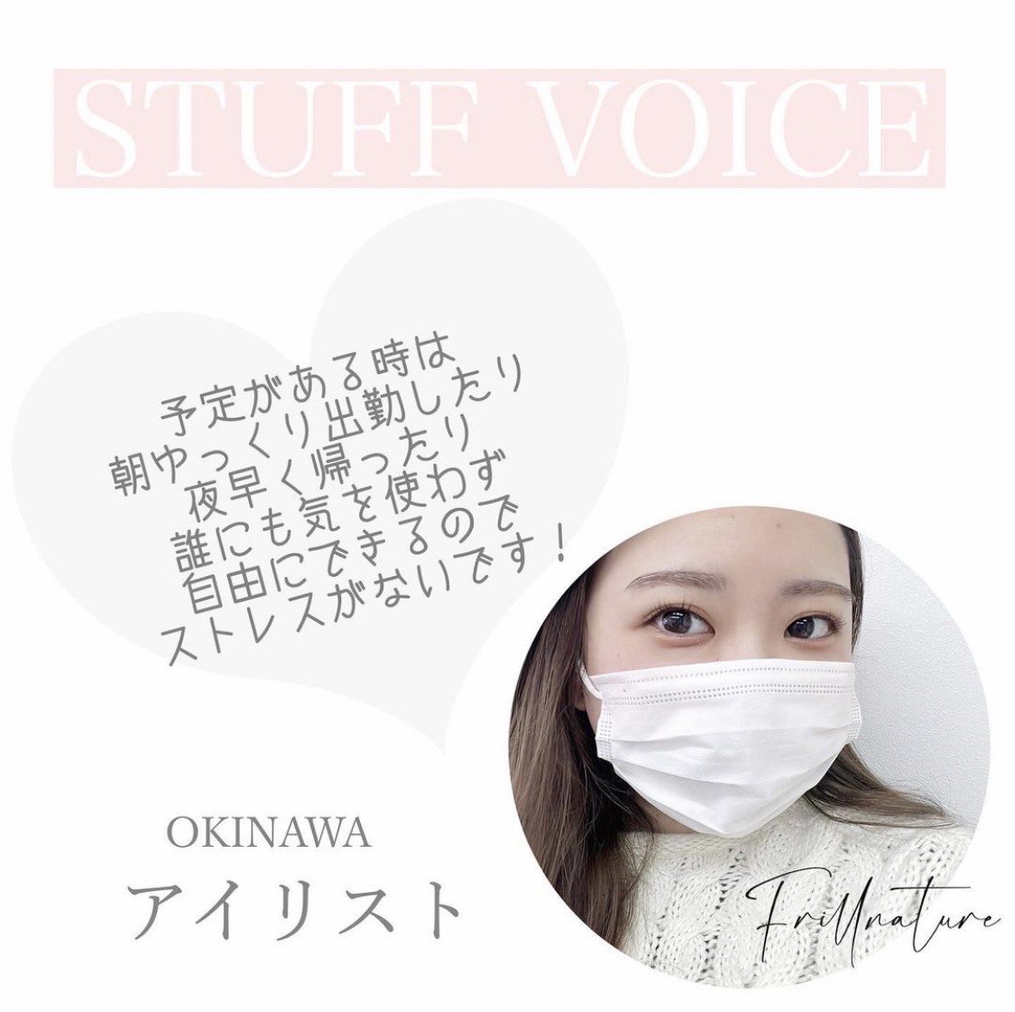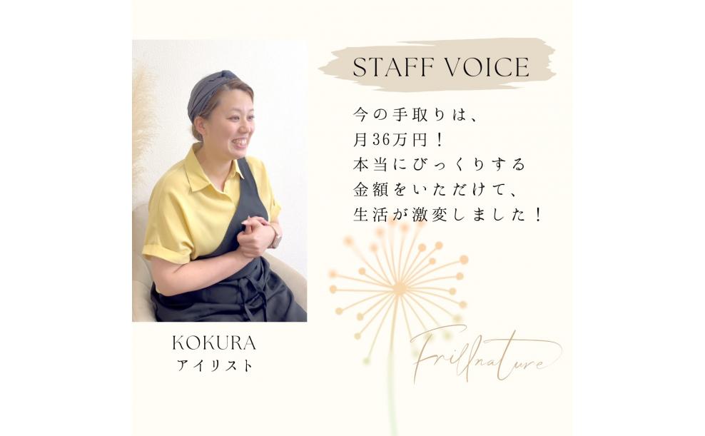 フリルナチュールで働く 5つの理由 ①高還元の報酬制度 フリルナチュールの雇用形態は業務委託契約となります。 「けど、業務委託って収入が下がることもあるんじゃない?」と不安に思われた方もご安心ください。 当店では、働き始めてから3ヶ月間は、月額20万円の報酬を最低保証としてお約束しています。 4ヶ月以降、月額20万円以上の報酬を受け取っていただけるように、集客面やリピート率のアップに向けて、本部が丁寧にサポートいたします。 ほとんどのスタッフさんは、3ヶ月後には、最低保証給以上のお給料を受け取っていただいています。 この制度により、今より収入が大きく下がることなく、働いたら働いた分だけしっかりと還元されます。 ご自身の働き方のスタイルで安心して働くことができます。 ②目の前のお客様を大切にできる 当店では、お客様一人あたりの施術時間は1~2時間です。 お客様が来店されたら、カウンセリングから始まり、お悩みをじっくりとヒアリング。 アイゾーンのお悩み、骨格にあわせて最適なデザインを提案し施術に入ります。施術後にメイクアドバイスをしてお見送りします。 お客様が来店されてからお帰りになるまで、お一人おひとりと丁寧に向き合うことができます。 ③自分のペースで働ける 完全予約制のため、あらかじめお休みしたい日時が決まっていれば、ご都合にあわせて自由に予約を調整することができます。 この日はお休みにしたい この日は午後出勤にしよう この日は早めに帰宅したい お客様の予約時間を守っていただければ、その他の時間は自由行動。お昼にコンビニに行くのはもちろんのこと、ランチやマッサージに行くのもOK。 業務委託契約のため、勤務時間にしばりがなく、その日の仕事が終わったらすぐに帰宅できます。 ④売上ノルマや後輩育成なし 当店には売上ノルマがありません。 売上、1日あたりの接客人数など、数字に追われることなく、ご自身のペースで働くことができます。 スタッフ全員がスキルを持ち自立しているため、後輩育成など教育を担当する必要がありません。 大規模サロンでよくみられる、売上のプレッシャーや後輩育成とは一切無縁です。 ストレスのない環境で、目の前のお客様に集中して施術していただけます。 ⑤マニュアル完備、眉の技術研修あり カウンセリングから施術まで、一連の業務の流れをまとめたマニュアルが完備されています。 このマニュアルに沿って接客・施術をすれば、お客様にご満足いただきながら、リピート率が80%を超えるようになっています。 たとえいま接客や技術に自信がなくてもご安心ください。 また「眉毛は未経験です」という方も大丈夫です。 眉の技術研修も用意しており、入客までにひと通りの技術を身につけることができます。 現在働いているほとんどのスタッフが、眉の施術が未経験からスタートしています。 フリルナチュールで働くアイリストの声 当店で働くアイリストはみなさん、最初は不安な気持ちを抱えていました。 しかし、ひとたびフリルナチュールで働き始めると、ライフスタイルが一変。 今までの職場では実現できなかった、高還元の報酬、時間の融通が利く生活など、みなさんのびのびとお仕事をされています。 「フリルナチュールで働けてよかったです!」という声を毎月のようにいただいています。 その中からほんの一部ですがご紹介します。 ①自由にできるのでストレスがないです! 初めてのことだらけで、最初は不安な気持ちでいっぱいでした。 でも何かあれば、すぐに対応してもらえるので安心してオープンできました! 予定がある時は朝ゆっくり出勤したり、夜早く帰ったり。 誰にも気を使わず自由にできるのでストレスがないです! 小規模サロンのため、お客様ともコミュニケーションが取りやすく伸び伸びと働けています♡ ②お給料も2倍近くアップしました! 最初はLINE対応が慣れておらず、大変なこともありましたが、 今ではお客様も増えて毎日楽しく働かせていただいてます! お給料も2倍近くアップしました! 前職では、他のスタッフとの兼ね合いもあり休み希望が通りづらかったのですが、今はシフトで自分で決められるようになりました。 旅行やライブに行ったりと、プライベートも充実しています♡ 勇気を出してフリルナチュールに転職して本当によかったです! この環境で働けて、とても幸せです! ③上下関係なしで、お客様と向き合える環境に満足 以前は、超回転型サロンに勤めていて、作業のような仕事で、大好きな美容の楽しみを忘れてしまっていました。 転職にあたり、お客様の細かいお悩みやこだわりまで、しっかりご要望にお応えする時間が取れることが技術職を続ける上での私の条件でした。 フリルナチュールは完全予約制で電話対応などの事務もなく、お客様としっかり向き合うことができます。この働き方が私にはとても合っています 店舗での上下関係はなく、1人でのびのびお客様(技術)のことだけを考