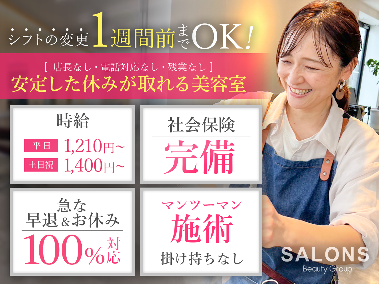 こんな悩みをお持ちではありませんか? ・物販ノルマのプレッシャーに疲れている ・アシスタント教育の負担が大きく、自分の施術時間が削られている ・閉店後の勉強会やミーティングで帰宅時間が遅い ・ 技術よりも営業や教育に時間を取られることが多い ・店長や先輩との人間関係に疲れている ・家庭との時間を大切にしたいが両立が難しい **一つでも当てはまるなら、ぜひサロンズビューティーグループの働き方をご検討ください** |