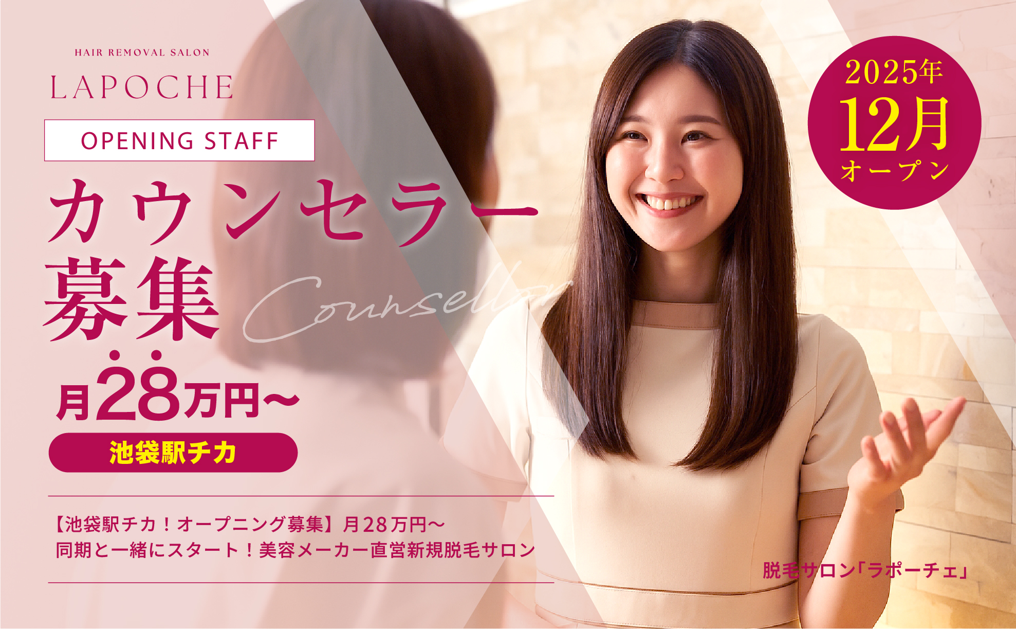 「美容の仕事に興味はあるけど、未経験だから不安…」 そんな方も安心してスタートできる環境をご用意しています。 当サロンでは、入社後すぐにお客様対応をお任せすることはありません。 まずは充実した研修制度で、脱毛機の操作や肌の知識、接客マナーを丁寧に学びます。 研修中は、先輩スタッフがマンツーマンで寄り添い、疑問や不安を一緒に解決。 実際にお客様を担当するのは「自信がついてから」で大丈夫です。 また、定期的に研修会や勉強会を開催し、新しい技術や美容知識も常にアップデート。 全員で成長を喜び合える“チームワーク重視”の職場だから、困った時はすぐに相談できる雰囲気です。 「美容が好き」「誰かをキレイにする仕事がしたい」 その気持ちがあれば、経験は問いません。 あなたも私たちと一緒に、お客様の笑顔をつくるお仕事を始めませんか? ❤️研修制度と先輩の寄り添いサポートで安心 入社後は基礎から丁寧に学べる研修制度あり。 お客様デビューまで先輩がマンツーマンで寄り添い、不安や疑問はその場で解決。 自信を持って施術できるようになってからお任せします。 ❤️チームワーク重視の温かい雰囲気 スタッフ同士で助け合い、成功や成長を一緒に喜べる職場です。 女性中心でもギスギス感ゼロ。新人さんもすぐに馴染めます。 ❤️ノルマなしでストレスフリー&高収入可能 固定給+インセンティブ制度で、未経験でも月収40万円以上が可能! ノルマがないから、数字に追われずお客様満足に集中できます。 希望休も取りやすく、プライベートと両立できます。 ❤️明確なキャリアアップ制度 技術を磨けばチーフや店長への昇格も可能。 資格取得支援や外部研修もあり、美容業界で長く活躍できます。 こんな方にぴったり! • 美容が好き、人をキレイにする仕事がしたい • 未経験からスキルを身につけたい • 高収入と安定を両立したい • チームで助け合いながら成長したい ✅【駅近】 ・池袋駅から徒歩4分でアクセス抜群 ・仕事帰りに買い物や友達とのご飯も楽しめる ✅【オープニング】 ・ピカピカの新店舗で働けるワクワク感 ・同期入社で仲間意識が強い! ・自分たちでサロンの雰囲気を作れる自由度 ✅【美容メーカー直営】 ・最新の機器・商材で安心の施術 ・美容が好きな方には嬉しい高品質な環境 |